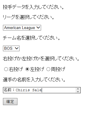 2019-02-20 【Java】選手情報を入力できるフォームを作ってみた。 Java プログラミング 野球 サーブレットを勉強したので、復習も兼ねて、どんどんアウトプットしていこう企画第2弾。HTMLのフォームから、サーブレットに渡して、フォームの内容を表示するというこれまた単純なもの。 フォームで入力した内容が、以下のように表示される。 今はただ表示させるだけやけど、次はこれをDBに入れてみよう。